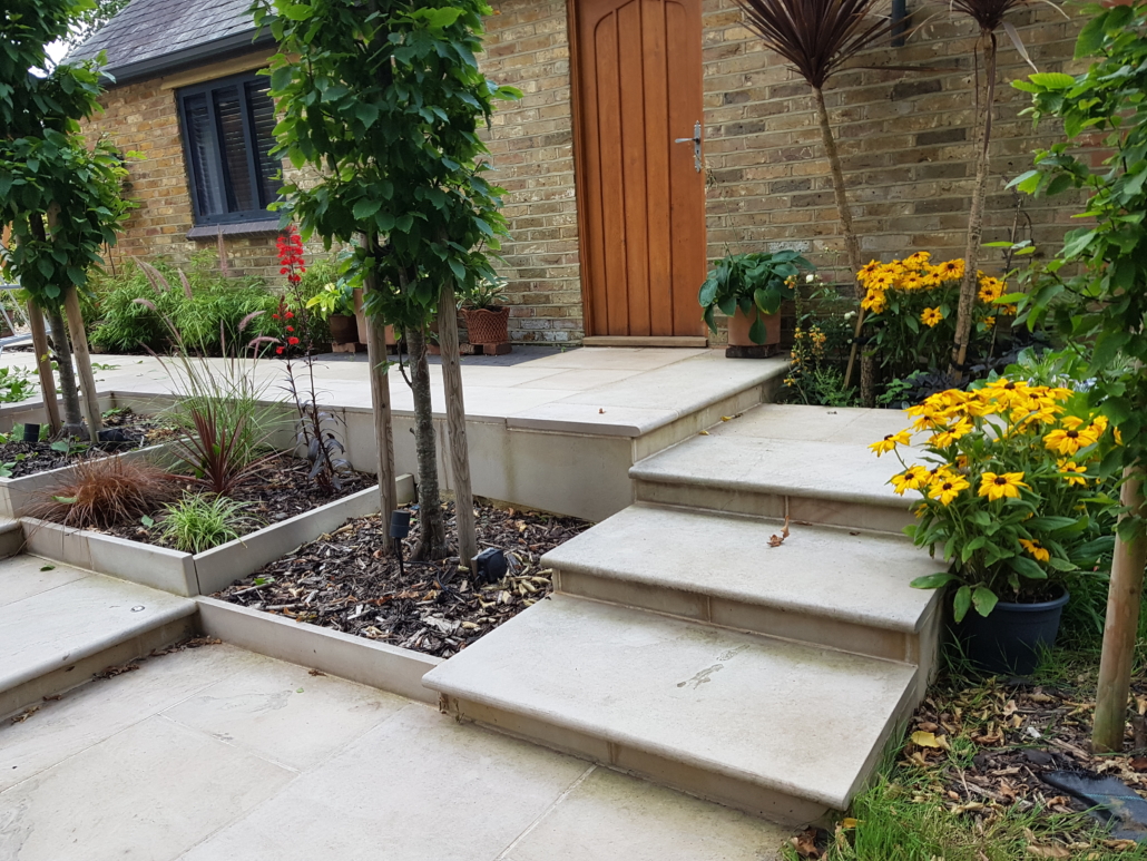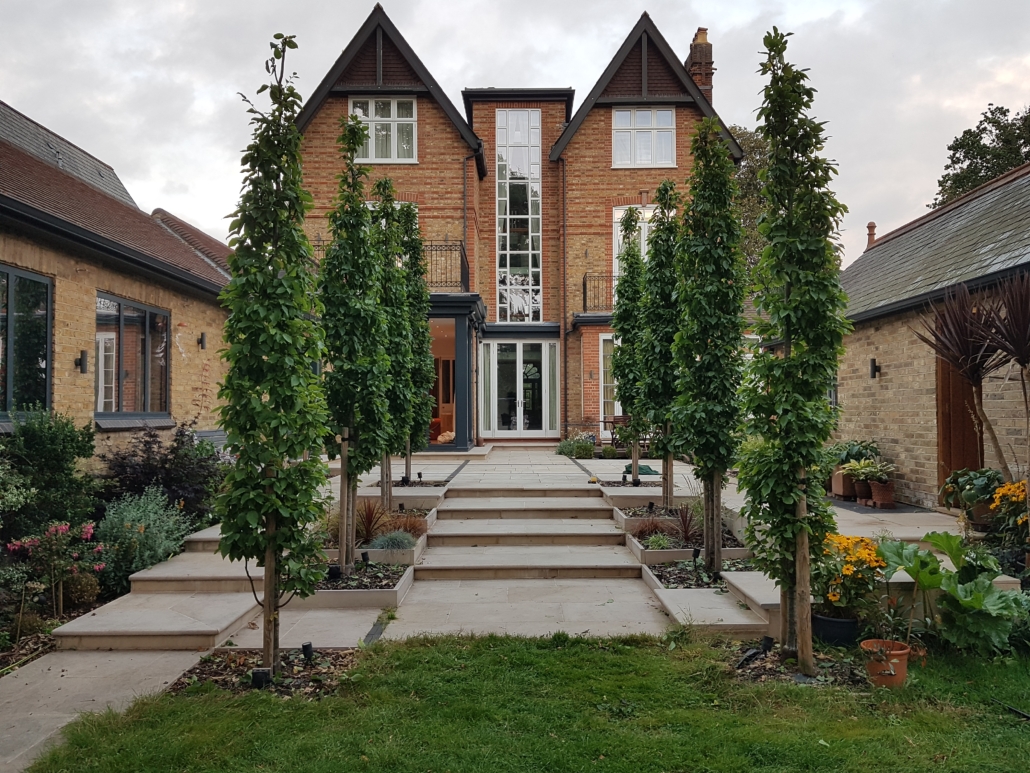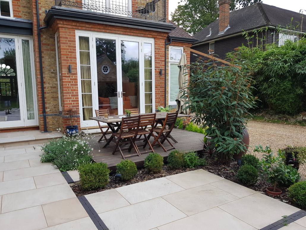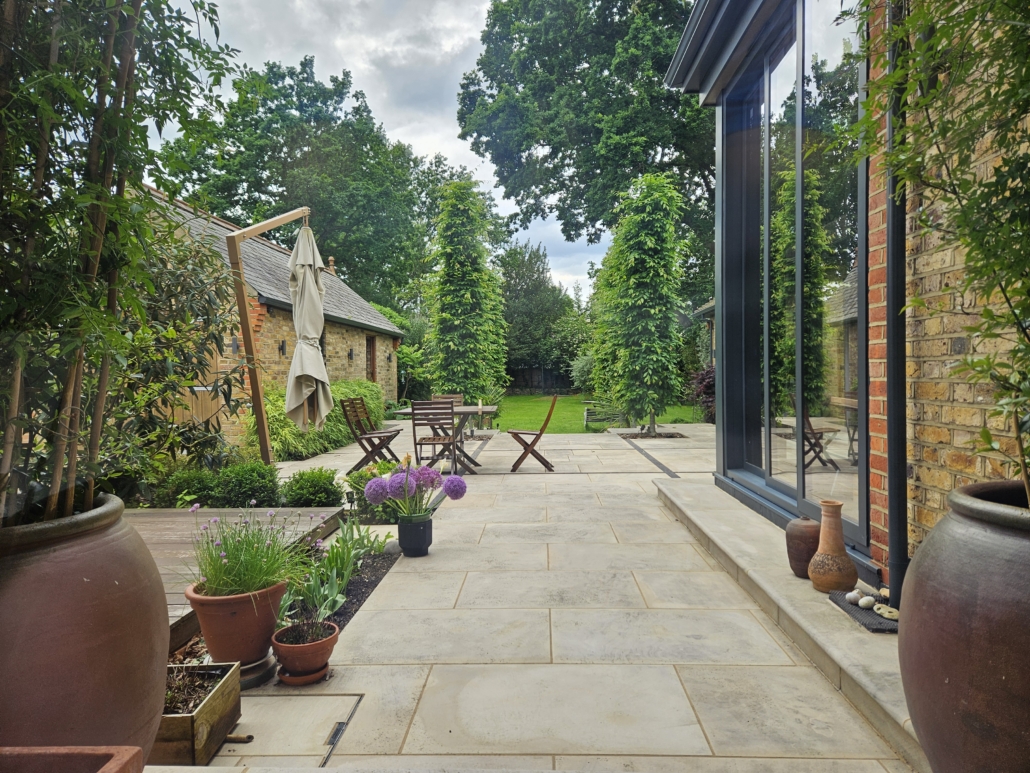 The design brief was to create an expansive terrace for entertaining surrounded with planting, with views and easy access to the tree lined garden beyond.