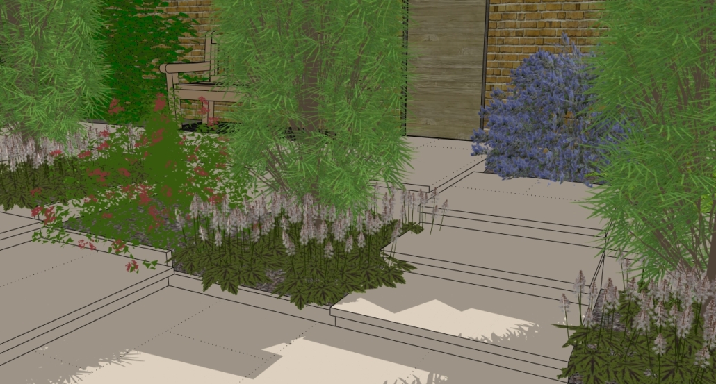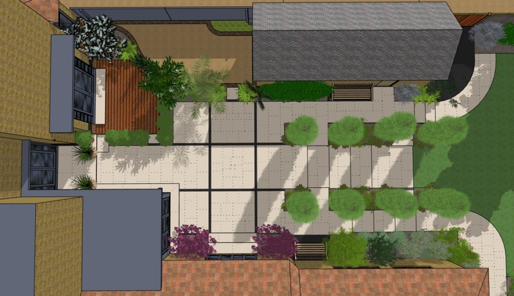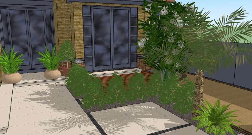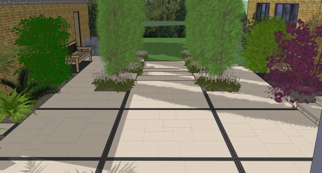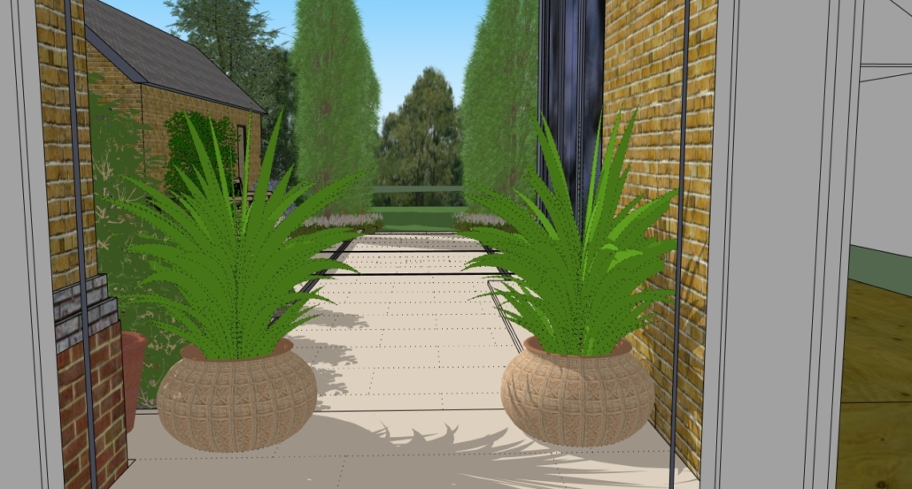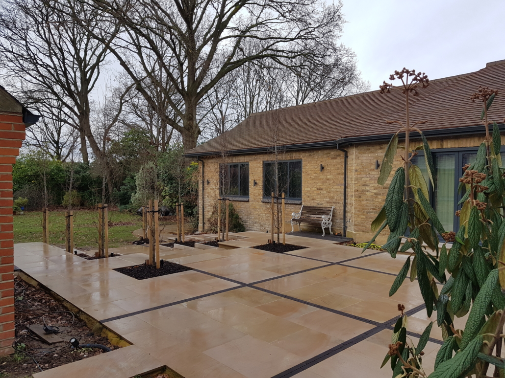 The design brief was to create an expansive terrace for entertaining surrounded with planting, with views and easy access to the tree lined garden beyond.
