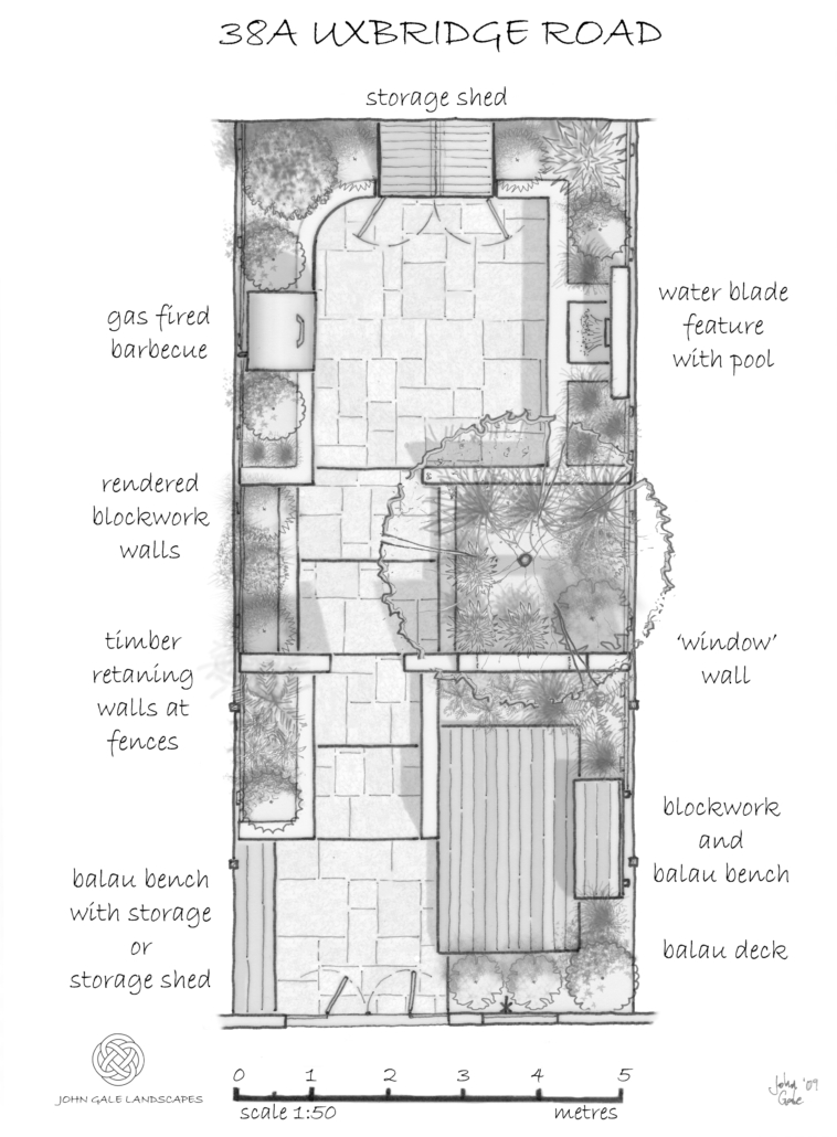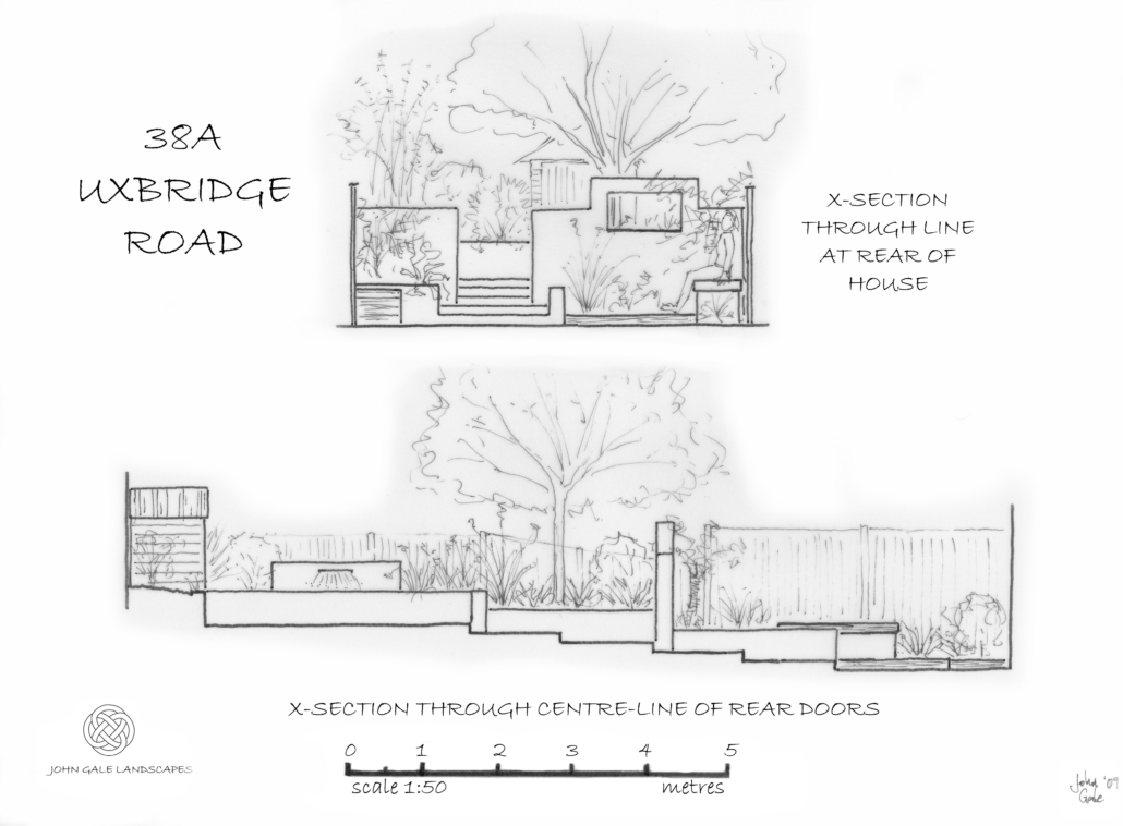 This Garden was originally designed in 2009 (black & white design drawing); the clients held on to it for 13 years (!) before approaching me again to re-visit the design and to finally build it.