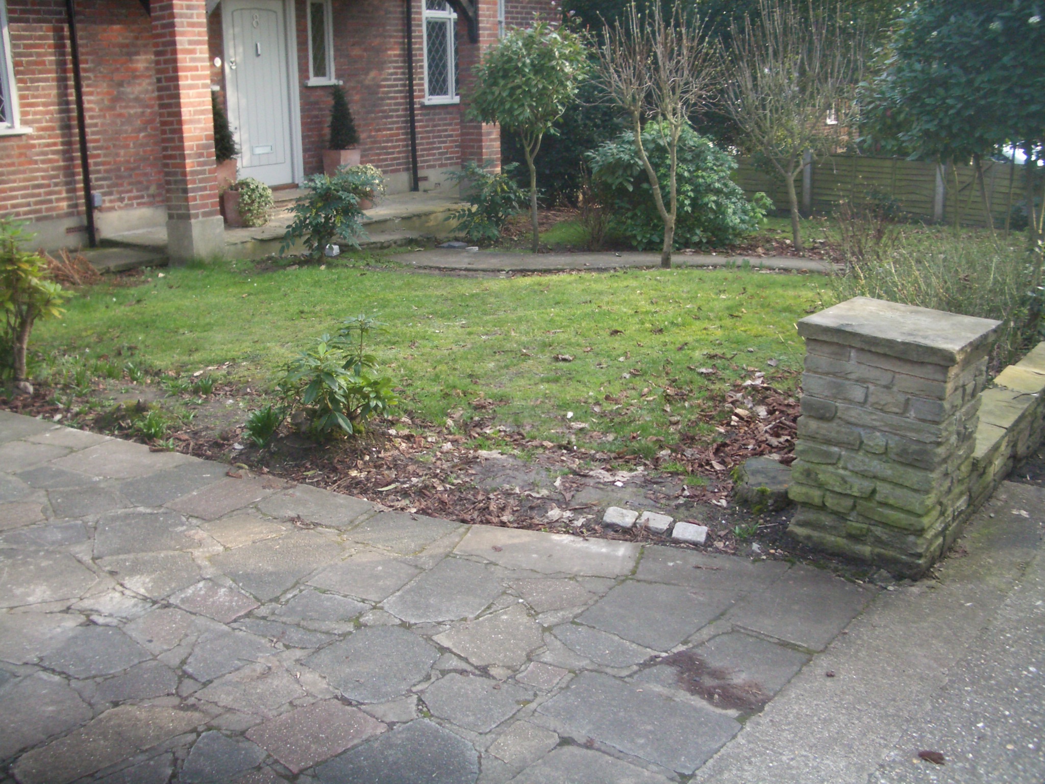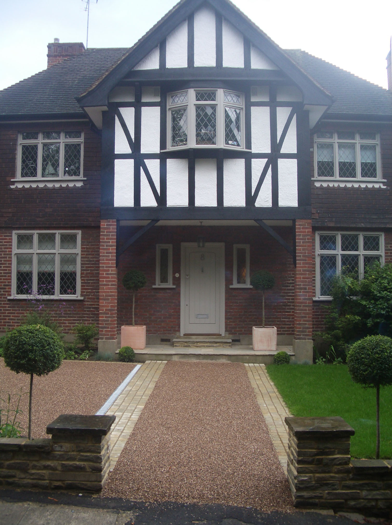 Once the children had grown up and bought cars, they were being parked on the lawn of this 1930s detached house, at which point a change was needed! Lots of open space was required, but without making it feel like a car-park; so with subtle use of granite sett lines and planting we succeeded in binding the different elements of driveway, front path and lawn together in one whole.