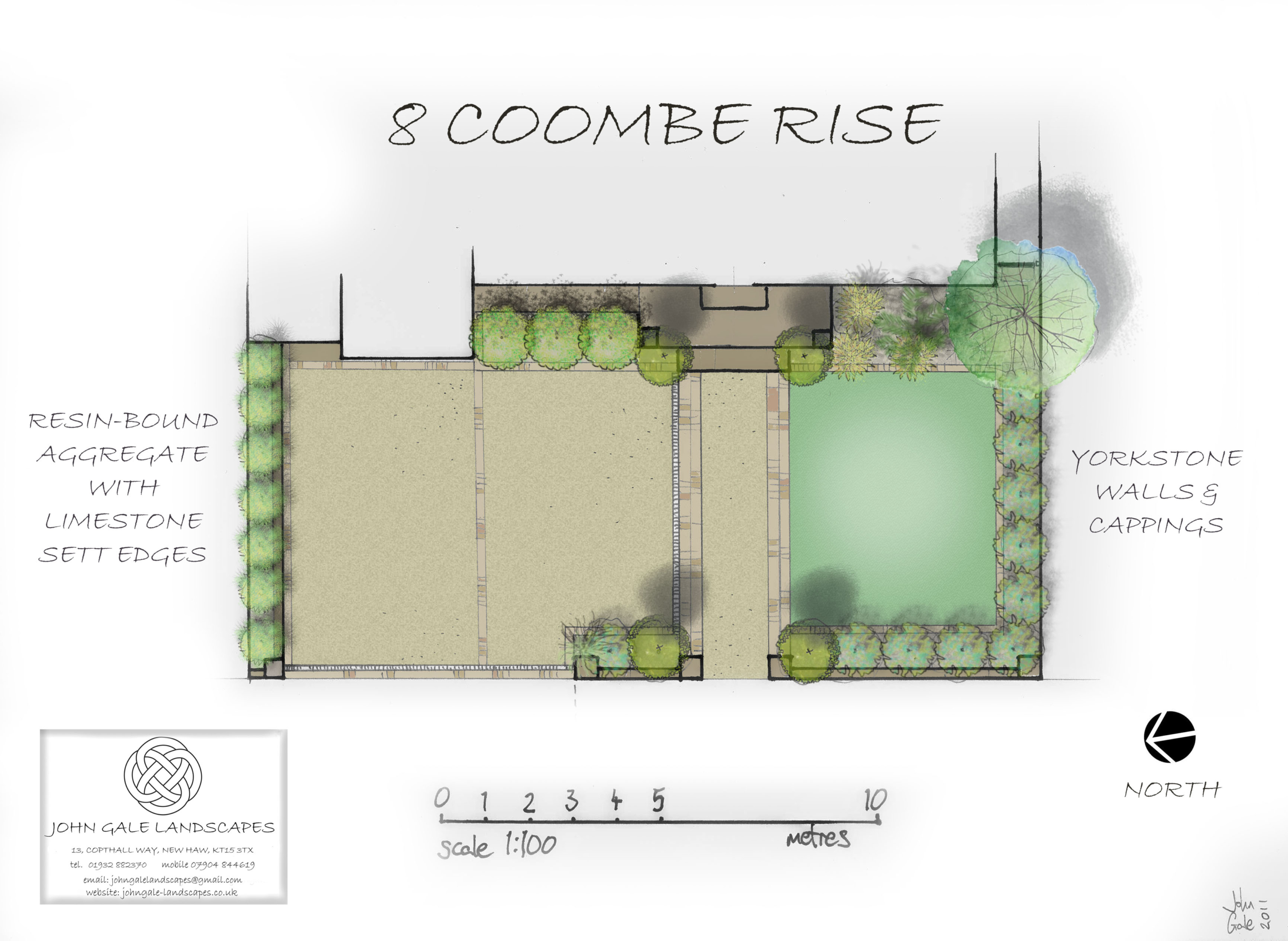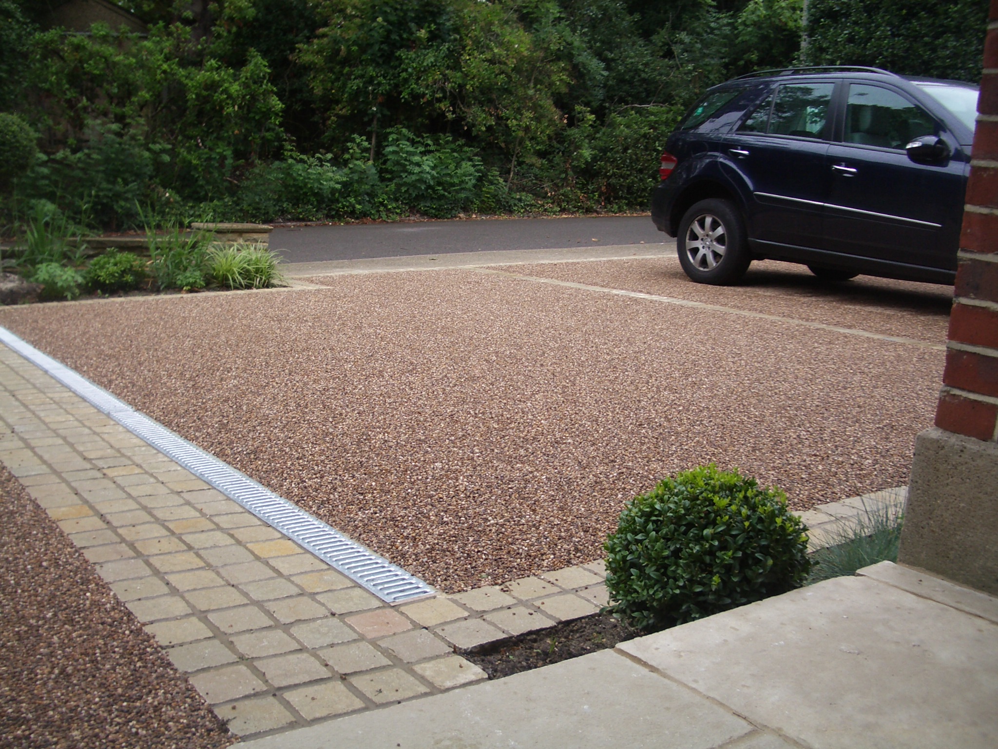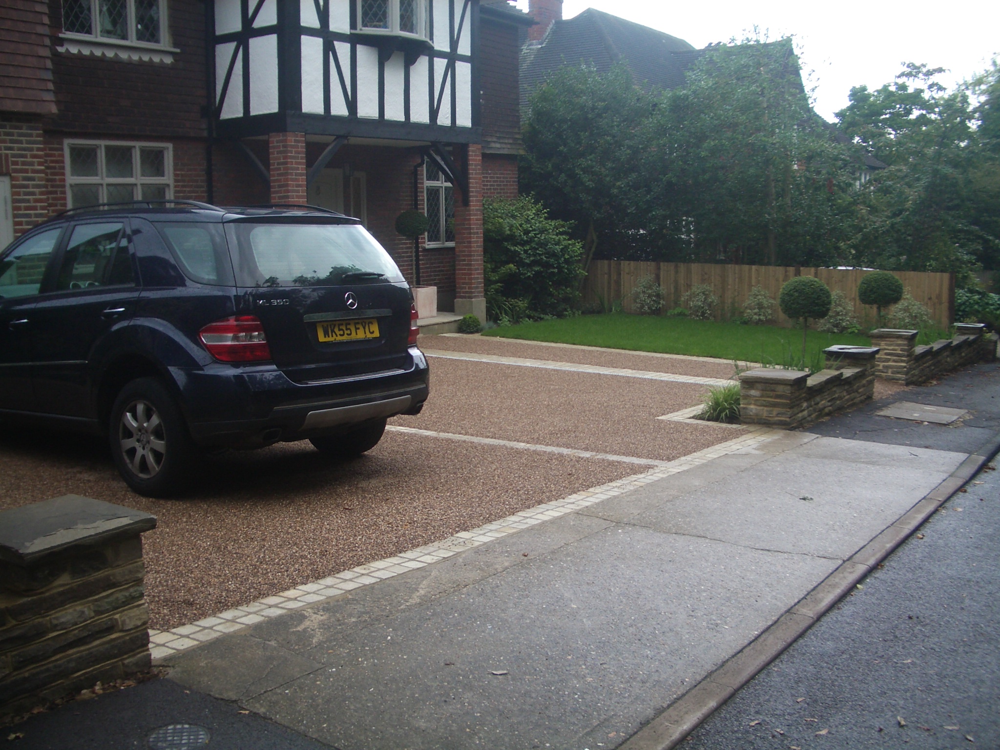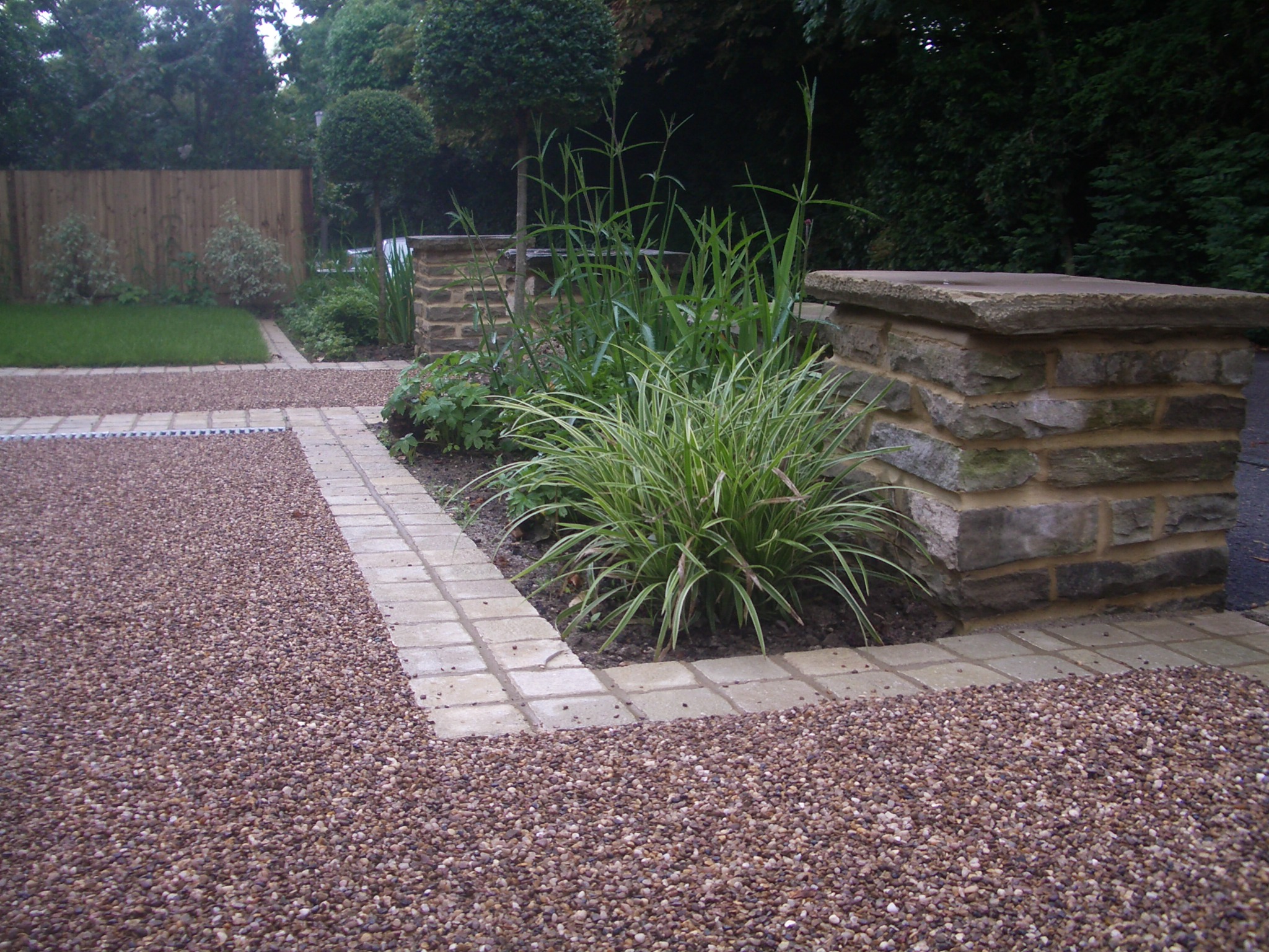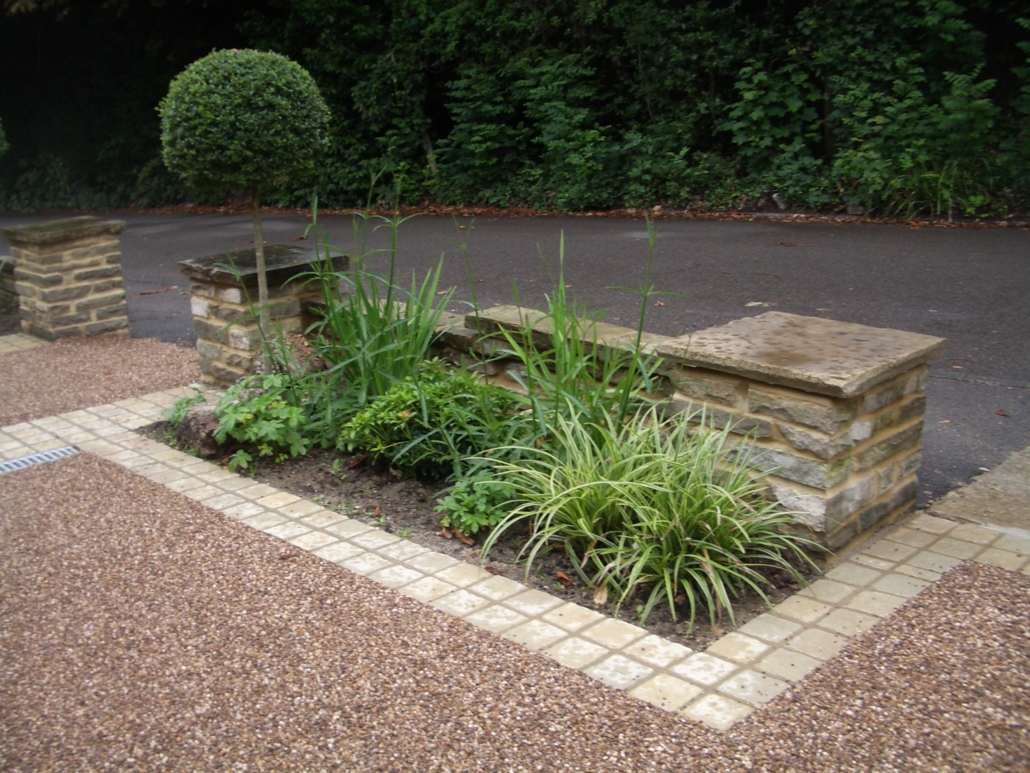 The existing York stone walls were dismantled and relaid on new foundations and a complete new sub-base and drainage system installed. Resin-bound aggregate was specified but was over budget, so resin-bonded aggregate was applied to concrete bases.