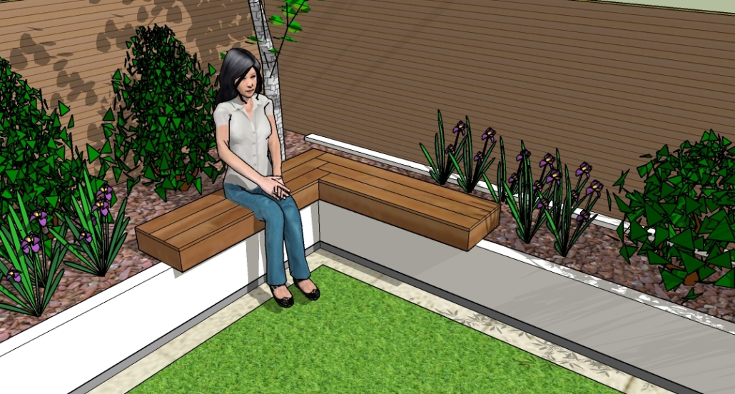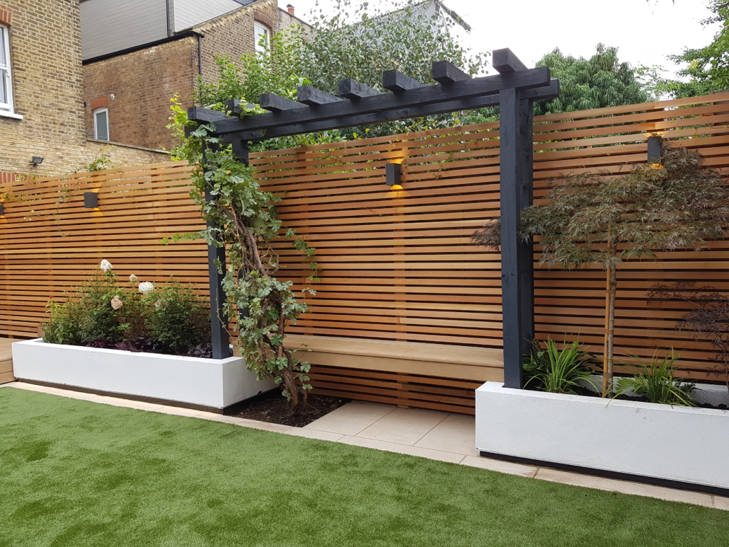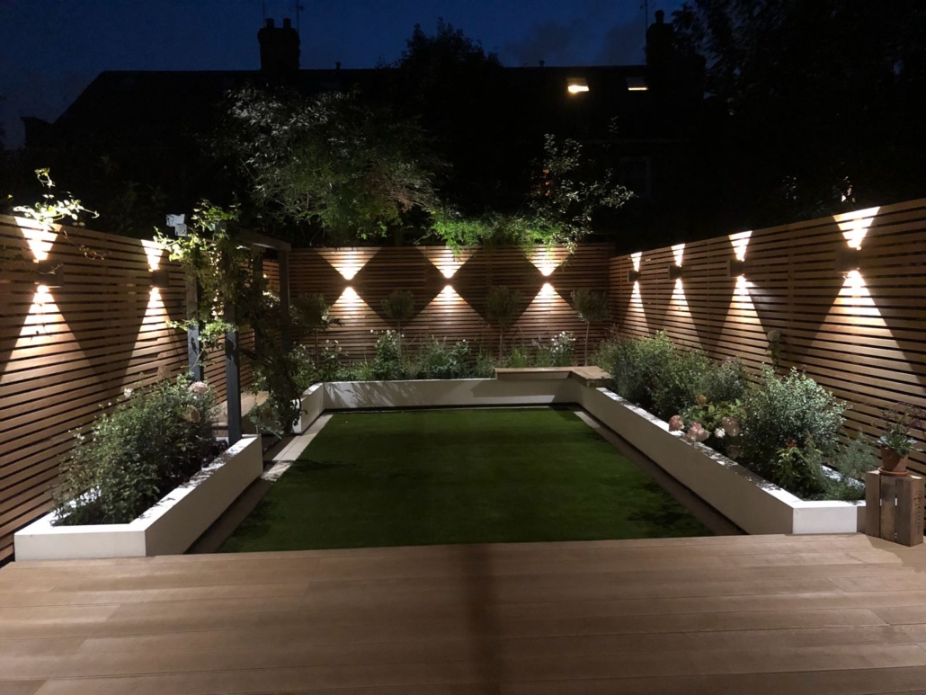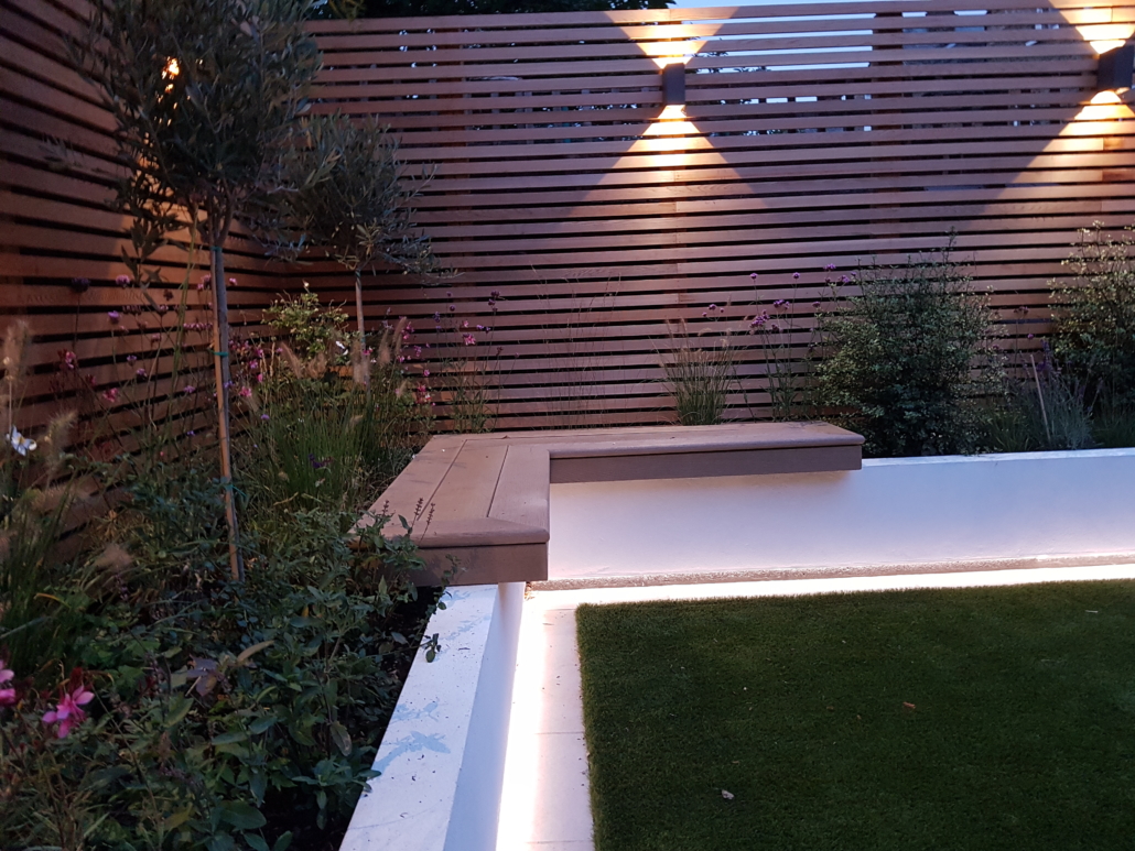 The screens are of cedar battens fixed to all new posts. There is an LED lighting strip set back under the overhang of the retaining walls, giving a sleek light cast across the surface of the grass. Lush planting is vital in this garden to bring it all to life.