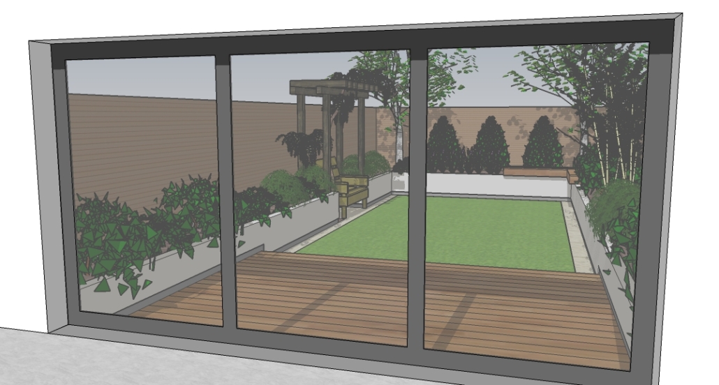 Porcelain paving surrounds the artificial grass, which is laid on a recycled rubber cushioning pad, ensuring that there will be no mud walked through the house. The deck and benches are constructed from Millboard composite deck boards, which dry off quickly after rain.
