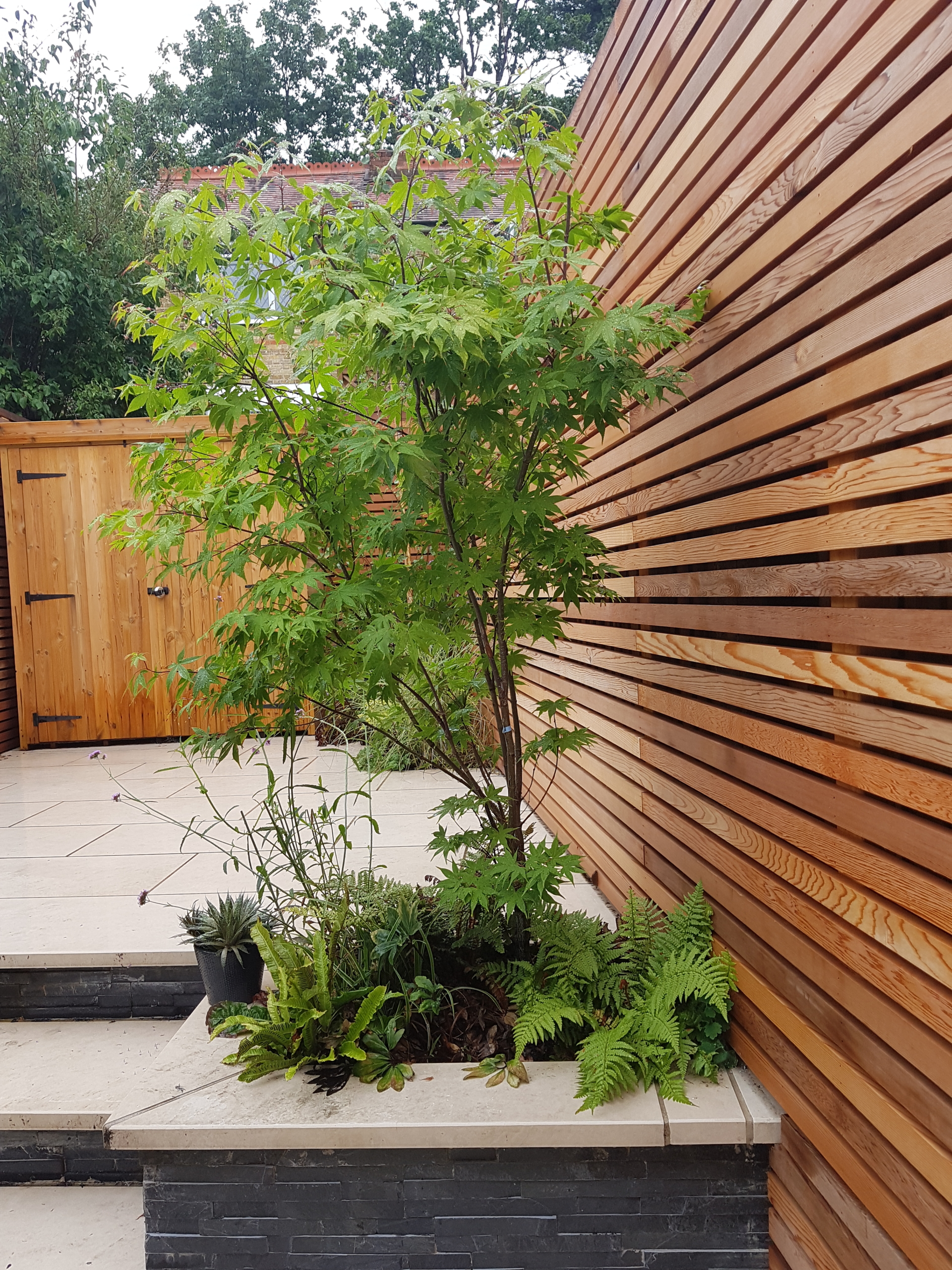 This tiny space was the smallest garden designed & built by us; it had added challenges, in that none of the boundaries were square to the house and that the levels sloped diagonally across the area.