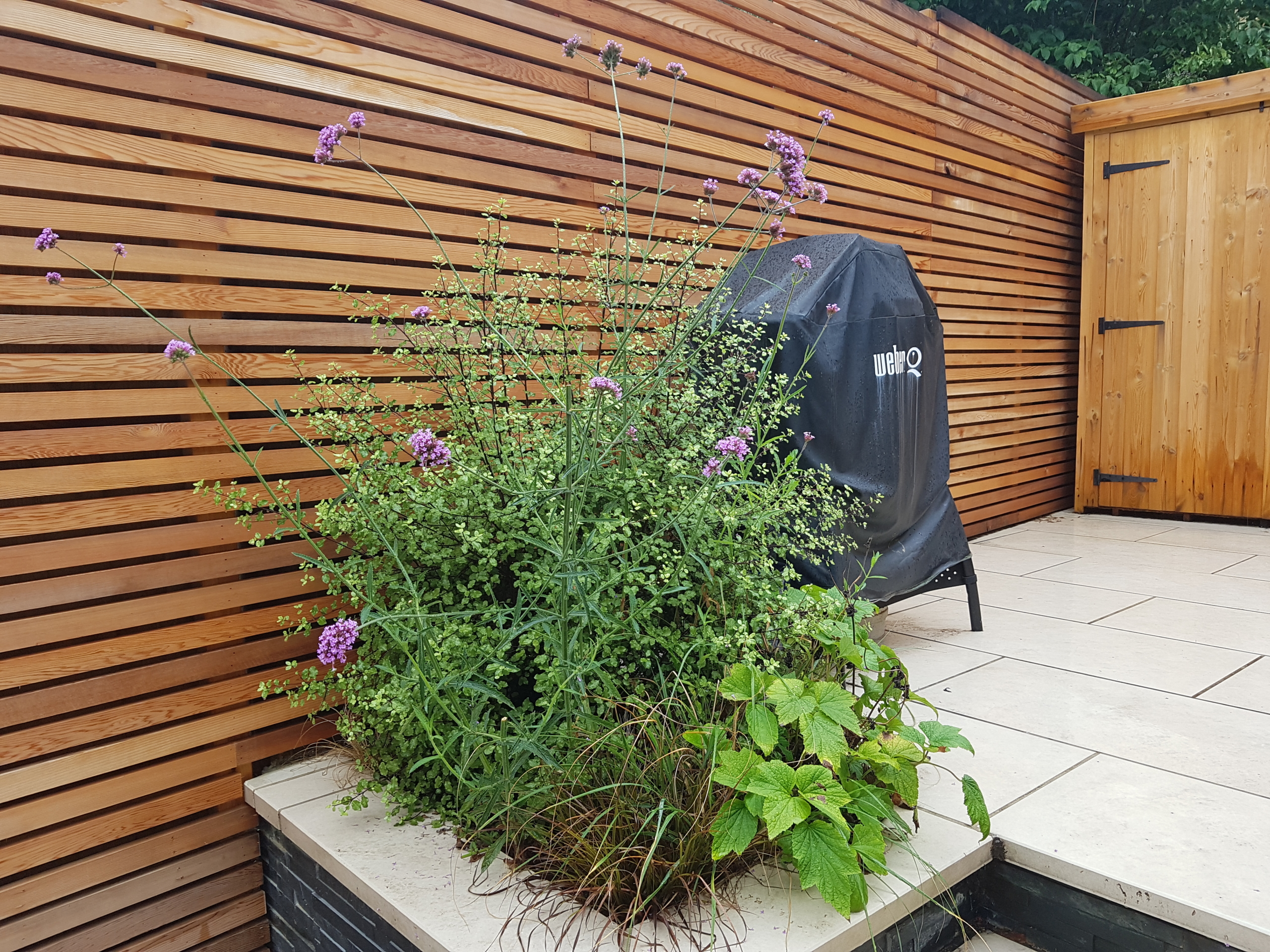 The black slate cladding gives a great contrast and the Cedar helps to soften the feel. The garden really comes alive at night with the simple addition of three spotlights and LED strip lighting concealed behind the edges of the steps & coping, casting textured light over the slate.