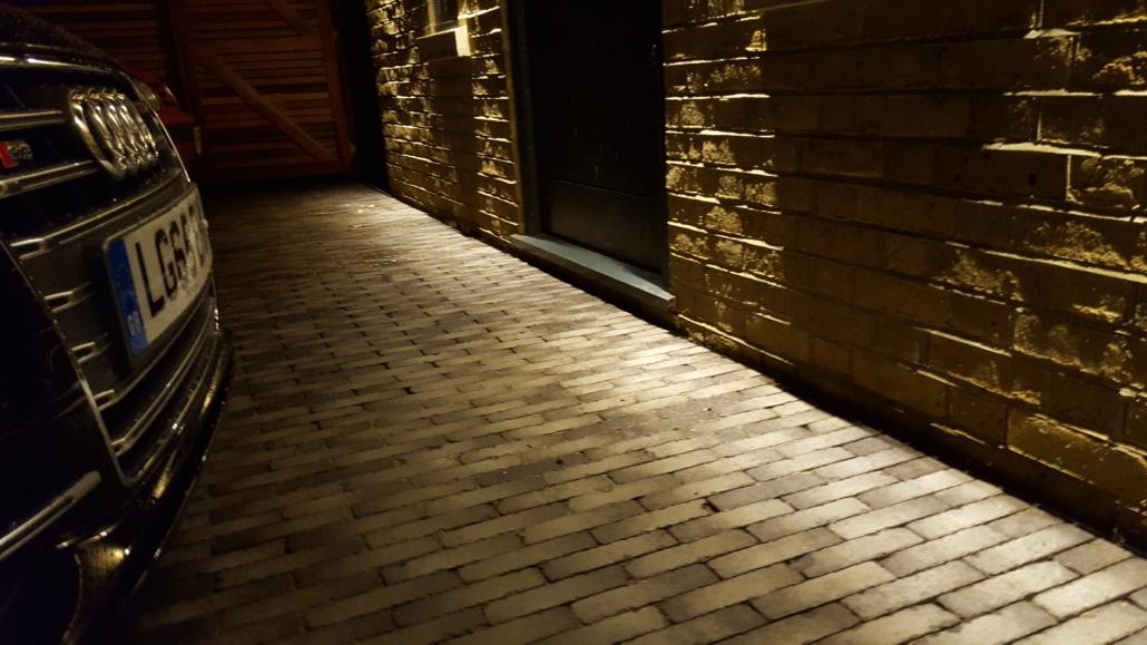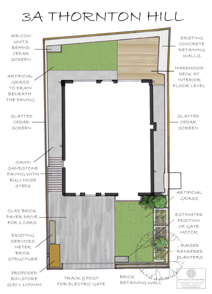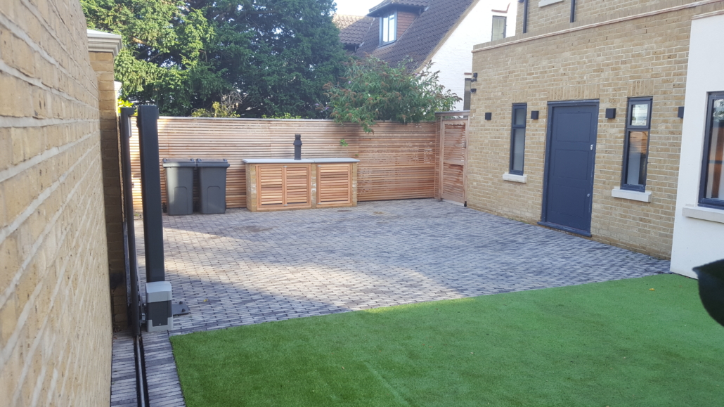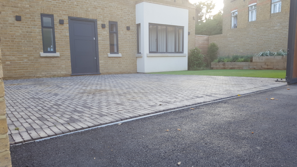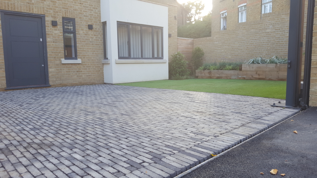 This house was a new-build on a small, sloping plot, the entire area was excavated and the basement & house built up from below ground. This front driveway and artificial grass lawn were to be built on top of a cinema room & gym!