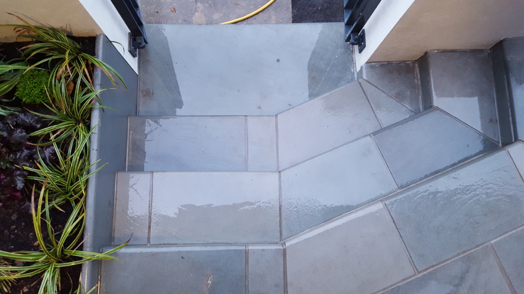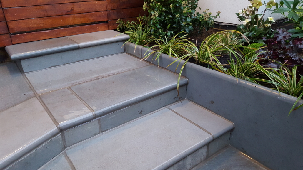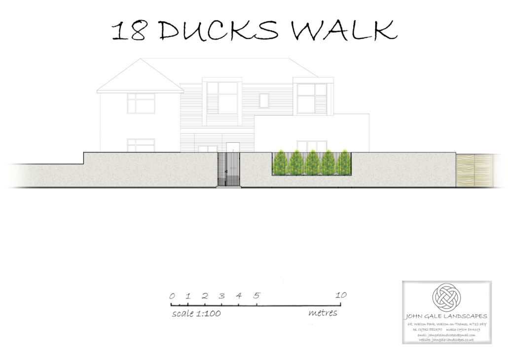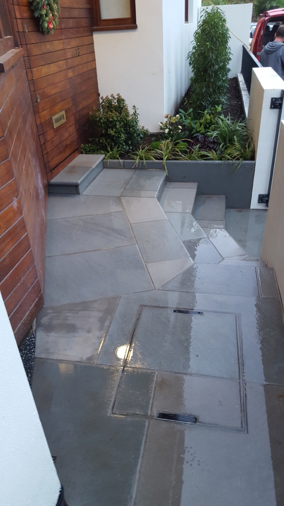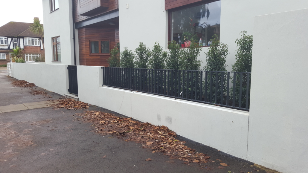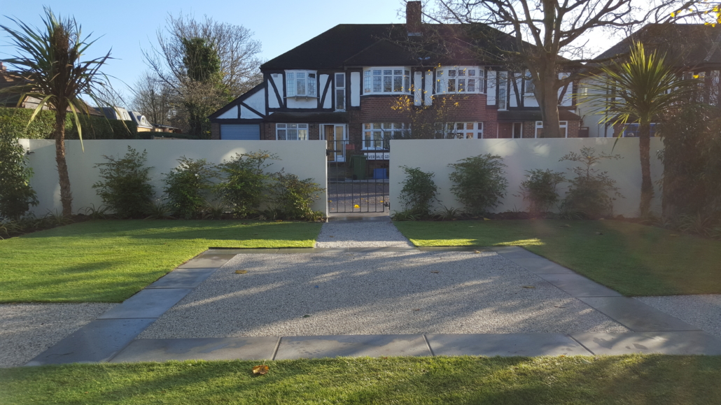 This front garden was designed & built twice! The first design was to create a front and side garden (the side of the house was where the front was located) with rendered walls and railings, to be formal, modern, simple & low maintenance. The simple design came from a central pedestrian gate leading to a square of paving with two paths leading to either side of the house.