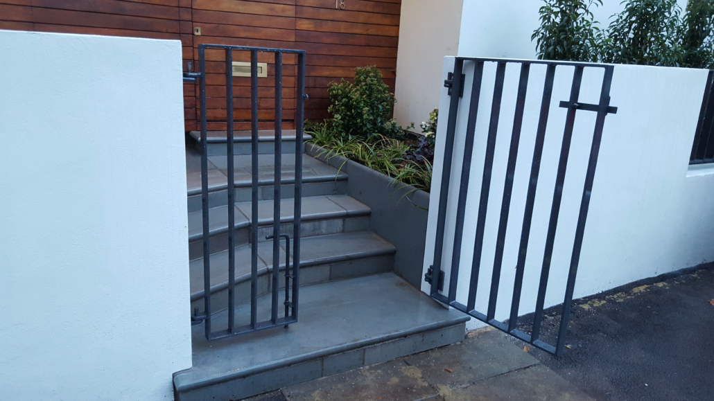 The right-hand path leads to the front door at the side of the house, where the angled shape of the entrance way informed the shape of the steps leading to the side gate. Both gates and the side railings were designed to match an existing railing on a rear balcony.